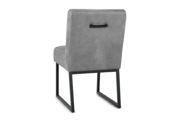 Eetkamerstoel Bullock van het merk Donc is beschikbaar in alle kleuren en in diverse materiaalsoorten zoals stof, kunstleder en rundleder. Deze eetkamerstoel is voorzien van zwart metalen poten, verticale banen in een kader in de rug en heeft geen armleuningen. De Bullock is ook beschikbaar met andere stiksels in de rug en met armleuningen. Deze stoel heeft een simpel, elegant design. Er zit een handgreep op de achterkant van de rugleuning, maar deze kun je ook weglaten.