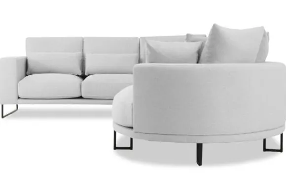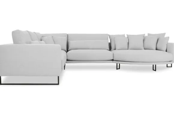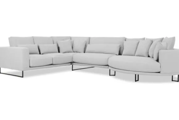 Hoekbank Dordoni II van het merk Be Inspired is verkrijgbaar in alle kleuren. Tevens is de bank leverbaar in materiaalsoorten zoals ribstof, teddy en velvet. Je kunt kiezen uit diverse afmetingen. De Dordoni II bank wordt standaard uitgevoerd met alle sierkussens en lendekussens die ook op de foto te zien zijn. De rugkussens daar achter zijn lekker hoog, deze combinatie zorgt voor een goede ondersteuning van de rug. Alle rugkussens zitten los en zijn omkeerbaar, de zitkussens zitten vast met klittenband. Het unieke aan de Dordoni II is het ronde loungegedeelte. Je kunt hier lekker wegkruipen tussen alle sierkussens. Deze bank oogt ruimtelijk door de hoge metalen sledepoten.