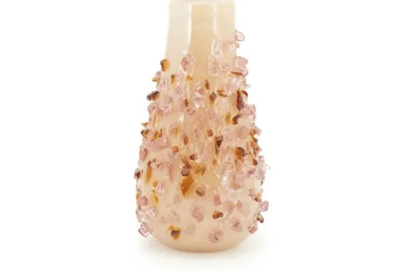De vaas heeft een unieke afwerking waarbij transparante en amberkleurige glasfragmenten als edelstenen over het oppervlak lijken te zijn gestrooid. Dit zorgt voor een fascinerend lichtspel en een dynamische textuur die direct de aandacht trekt.