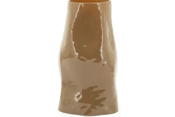 De bruine kleur en de subtiel golvende textuur geven de vaas een speels en ambachtelijk karakter. De glanzende afwerking reflecteert het licht op een subtiele manier, wat een extra dimensie aan het ontwerp toevoegt.