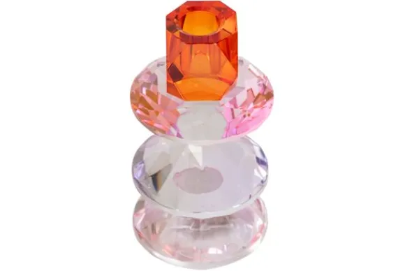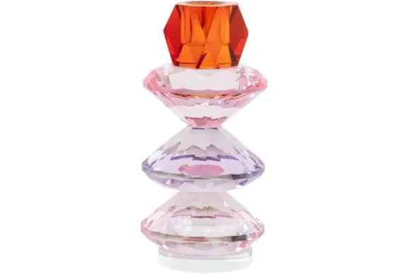 Kandelaar Yalena 212686 van het merk Richmond Interiors is vervaardigd uit glas. De kandelaar heeft een unieke uitstraling door de verschillende vormen. De kandelaar is doorzichtig roze, paars en oranje van kleur en is geschikt voor dinerkaarsen.