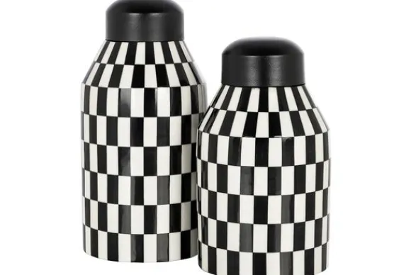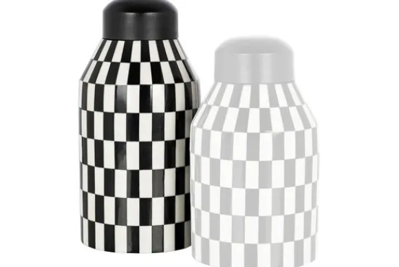 Pot Malou 211543 groot van het merk Richmond Interiors is gemaakt van metaal en resin, dit is een mix van gemalen steen in combinatie met vloeibare kunsthars. De pot is een zwart/wit geblokt accossoire wat je interieur compleet maakt. Tip: combineer deze pot met de kleinere variant.