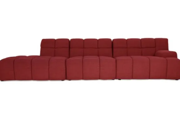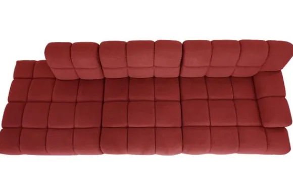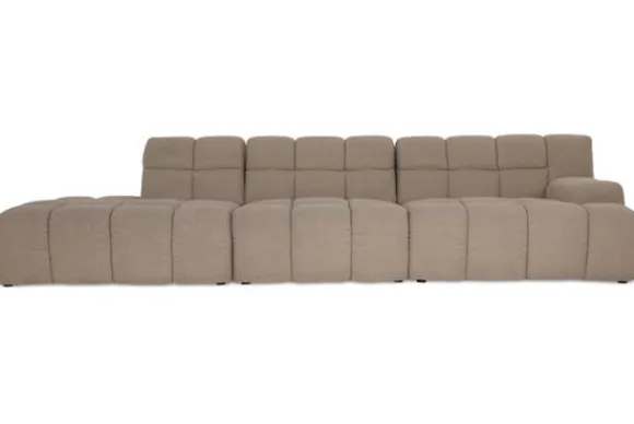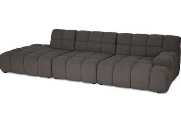 Bankstel Trentino van het merk Moderno is een bank met geblokte zit- en rugkussens en een zitting die doorloopt tot net boven de grond.