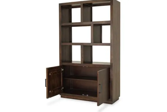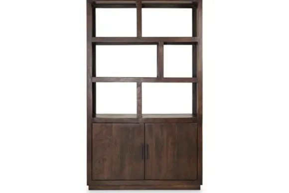 De kast is voorzien van open vakken in verschillende afmetingen, wat zorgt voor een speels geheel en ruimte voor decoratie. Aan de onderzijde bevinden zich twee deuren voor extra opbergruimte.