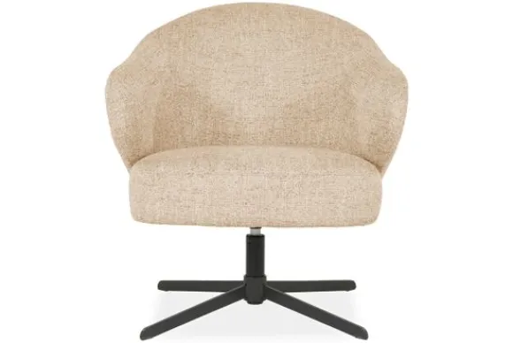 De stevige, zwarte metalen kruisvoet contrasteert subtiel met de lichte bekleding en zorgt voor een modern, industrieel accent. Dankzij de 360 graden draaifunctie biedt deze fauteuil maximale bewegingsvrijheid en flexibiliteit – ideaal in een leeshoek, naast de bank of in een stijlvol kantoor.