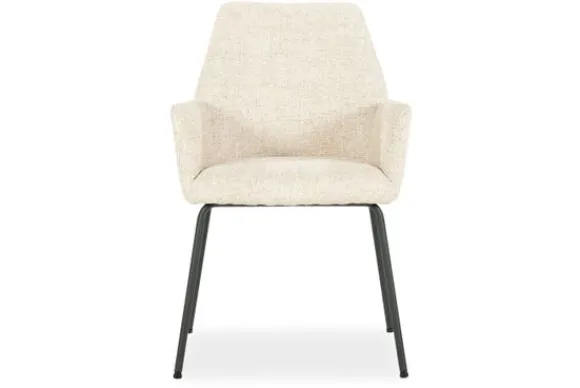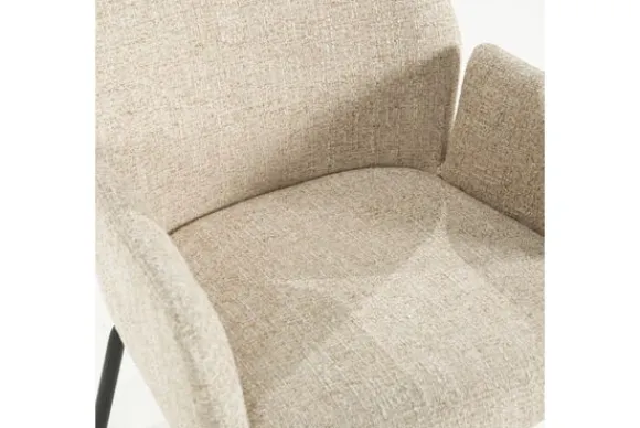 De licht hellende rugleuning en de volledig gestoffeerde armleuningen bieden een zintuiglijk zitcomfort, perfect voor lange diners of ontspannen gesprekken aan tafel. De fijne structuur van de stof voegt een tactiele gelaagdheid toe die zowel luxe als huiselijkheid oproept.