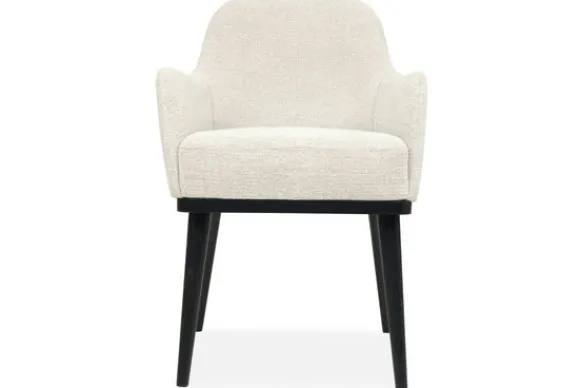 De licht uitlopende poten geven de stoel een elegante, luchtige uitstraling, terwijl de comfortabele kuip met armleuningen uitnodigt tot lang tafelen in stijl.