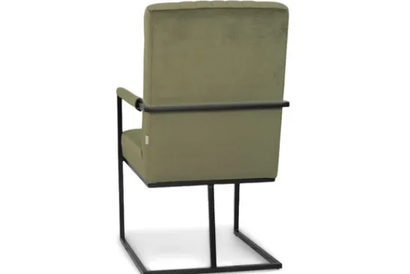 Deze stoel wordt standaard uitgevoerd met zwart stalen poten die doorlopen tot armleuningen. De armleuning zijn gestoffeerd.