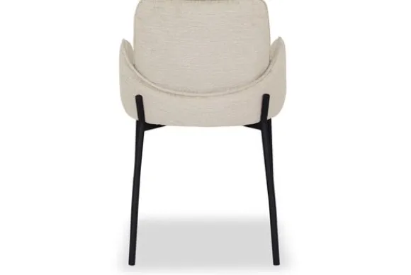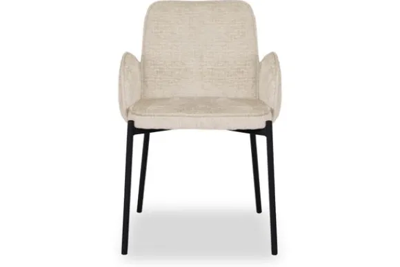 Eetkamerstoel Joni, uitgevoerd in cream elegance heeft een luxe ronde zitting, rugleuning en is in het bezit van armleuningen. Deze combinatie maakt Joni een luxe eetkamerstoel met ontzettend veel comfort. De armleuningen lopen achter de rugleuning langs waardoor de eetkamerstoel een uniek uiterlijk krijgt en er ook nog eens ontzettend leuk uitziet aan de achterkant. Dat is natuurlijk een fijne bijkomstigheid als de eetkamerstoelen aangeschoven staan aan tafel. Het ranke maar doorlopende zwarte frame waar de zitting als ware op rust geeft de eetkamerstoel een luchtige uitstraling. Het uiteinde van het frame loopt op vier zijdes een klein stukje door wat zorgt voor een speels effect.