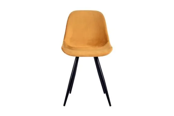 Eetkamerstoel Capri heeft een zeer luxe en comfortabele kuip uitgevoerd in oker fluweel, voorzien van elegante rondingen. Tevens is Capri in het bezit van licht uitlopende poten, uitgevoerd in zwart metaal waardoor de stoel stevig op de grond staat en ook nog eens een leuke speelse touch krijgt. Capri is een stoere eetkamerstoel voorzien van de meest prachtige vormen, materialen en contrasten, wat Capri maakt tot een unieke, comfortabele stoel die helemaal in de dagelijkse trend past.
