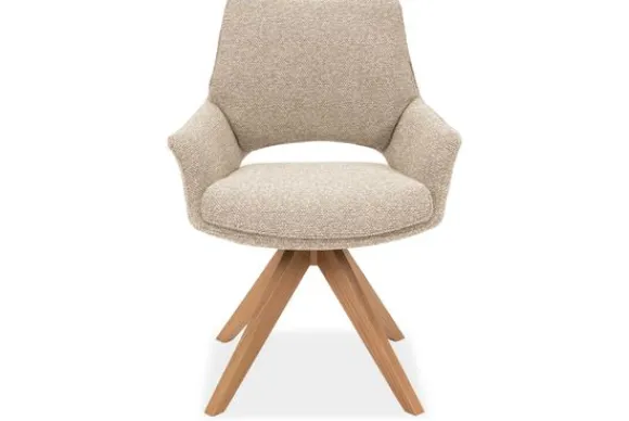 Eetkamerstoel Selene is samen te stellen met vier verschillende onderstellen van metaal of hout. Afhankelijk van het gekozen onderstel is de stoel 180 graden of 360 graden draaibaar. Bij deze uitvoering is gekozen voor een houten poot in de kleur naturel die 360 graden draaibaar is en is voorzien van autoreturn.