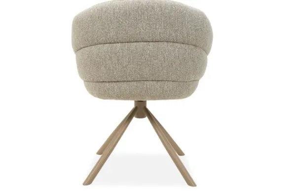 Eetstoel Pleko van het merk Divani is een moderne draaistoel die comfort en functionaliteit stijlvol samenbrengt. De zitting heeft een ronde, uitnodigende vorm met een zachte rug en geïntegreerde armleuningen die zorgen voor een geborgen en comfortabele zit. De stoel is uitgevoerd in de stof Lodge Shiitake 124.