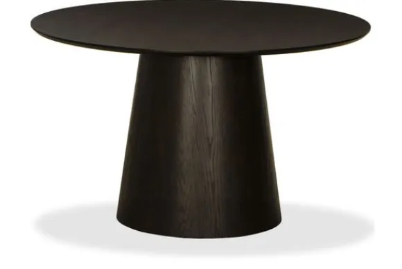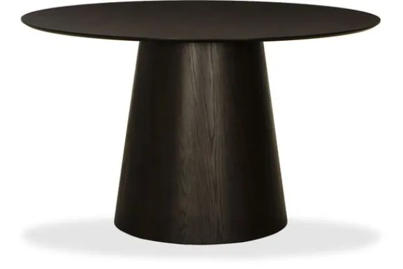 Eettafel Novero van het merk Livingfurn in de kleur Espresso heeft een rond blad en een stevige kolompoot. De ronde eettafel past met de diepbruine kleur en eenvoudige vormen goed binnen een Japandi of modern interieur.
