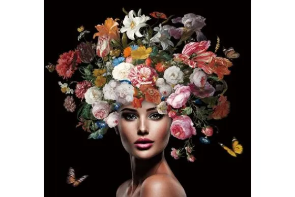 Glasschilderij Cinderella 080080-097 van het merk Ter Halle toont een verbluffende combinatie van elegantie en flora, met een kunstzinnige en expressieve compositie. Het middelpunt van dit schilderij is een prachtige vrouw met een serene, mystieke uitstraling. Haar haren zijn vervangen door een overvloedige, weelderige kroon van bloemen, die in rijke kleuren zoals roze, rood, wit en oranje zijn weergegeven.
