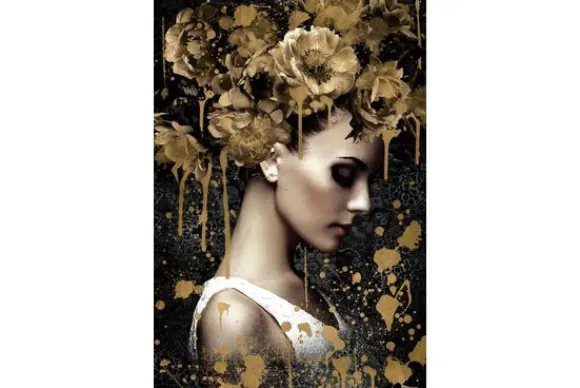 Glasschilderij Vrouw met gouden bloemen 080120-1038 van het merk Ter Halle toont een elegante vrouw met gouden bloemen op haar hoofd. De goude verfspetters over het beeld geven een artistieke uitstraling en sluiten goed aan bij een hotel chic of modern interieur.