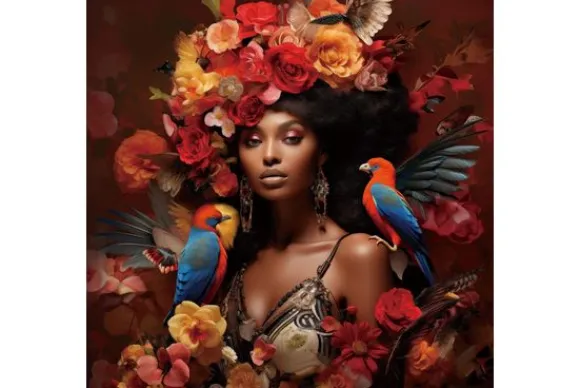Glasschilderij Vrouw met Vogels en Bloemen 080080-190 van het merk Ter Halle is 80 cm breed en 80 cm hoog. Op dit schilderij is een vrouw afgebeeld, die omringd is door kleurige vogels en bloemen. Een glasschilderij heeft levendige kleuren, een glanzende afwerking en een realistisch diepte-effect. Al deze eigenschappen zorgen voor de luxe uitstraling van een glasschilderij. Dit schilderij wordt met een ophangsysteem geleverd.