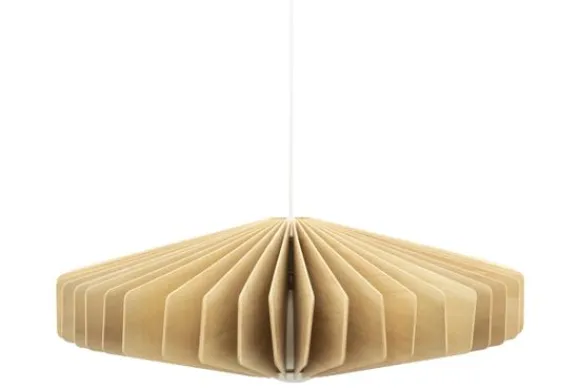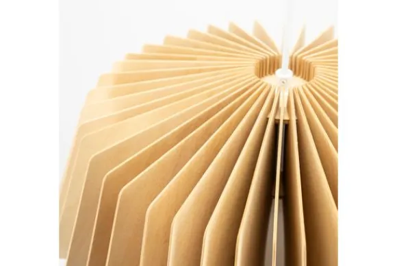 De houten lamellen, afgewerkt met een coat finish, geven de lamp een warme, organische uitstraling. Het licht wordt op speelse wijze gefilterd, waardoor een fascinerend schaduwspel ontstaat dat een sfeervolle ambiance creëert.
