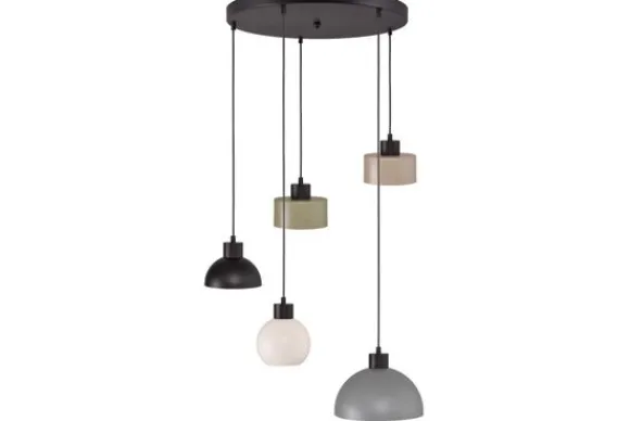 Hanglamp Monton van het merk Masterlight is een simplistische lamp met een mooie elegante vormen. De speelse hanglamp geeft sfeer binnen je interieur om gezellig samen aan tafel urenlang van elkaar te genieten met een drankje en hapje. De hanglamp heeft vijf lampenkappen met verschillende tinten, vormen en maten. Deze hanglamp heeft: één white lampenkap met een diameter van 15 cm, één beige lampenkap met een diameter van 15 cm, één olive green lampenkap met een diameter van 15 cm, één matt black lampenkap met een diameter van 16 cm en één denim blue lampenkap met een diameter van 25 cm Er zit geen lichtbron bij deze lamp. Maak de lamp compleet door bij “Maak je aankoop compleet” de lichtbronnen erbij te kiezen.