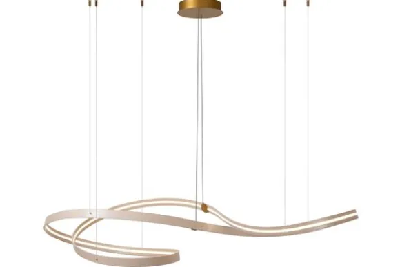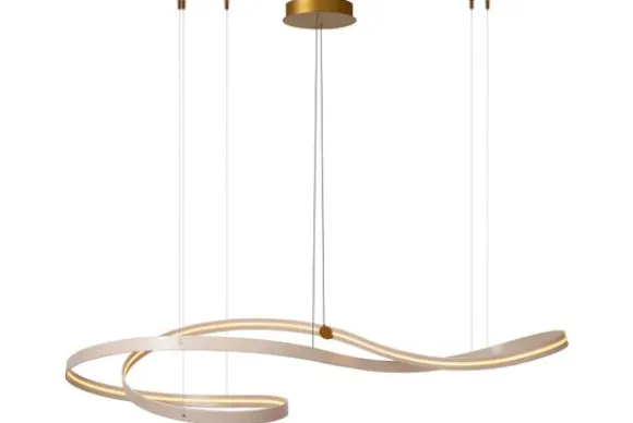 Hanglamp Slalom van het merk Lucide is een moderne designlamp met een vloeiende, golvende vorm die onmiddellijk de aandacht trekt. De aluminium afwerking geeft een luxe uitstraling en maakt de lamp een echte blikvanger boven de eettafel, in de woonkamer of in een ruimtelijke hal.