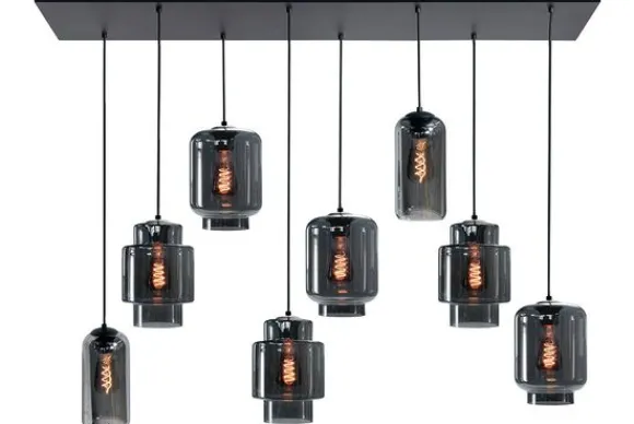 Hanglamp Fantasy van het merk Highlight heeft acht lampen met glazen lampenkappen. Deze acht lampen zijn verstelbaar in lengte. De maximale lengte is 130 cm. De lampen kunnen op verschillende hoogtes gehangen worden, waardoor je een speels effect creeërt. Door het rookglas heb je naast sfeervol zijwaarts licht, ook goed licht dat naar beneden schijnt. Deze hanglamp heeft een rechthoekige plafondbevestiging. De plafondbevestiging is matzwart en heeft de afmeting 130 cm x 35 cm. De Fantasylijn bestaat uit plafondlampen, een tafellamp, wandlamp en vloerlamp. Deze zijn er zowel in rookglas als amberglas. Maak je interieur helemaal af met deze complete serie.