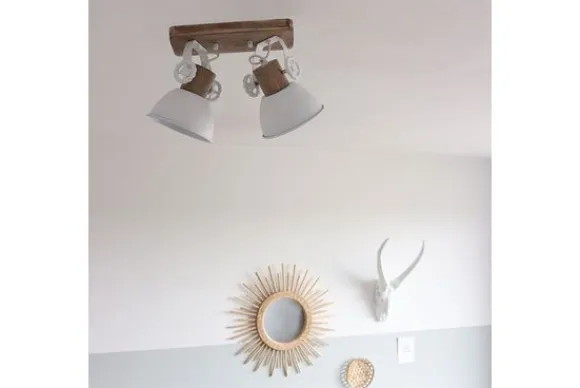 Plafondlamp 7969W Mexlite Gearwood van het merk Steinhauer is een witte plafondlamp vervaardigd uit metaal en hout. Door de houten accenten en grote verstelwielen heeft de plafondlamp een stoere en industriële uitstraling. De lamp is voorzien van een 2-lichts spots met een E27 fitting en is geschikt voor lichtbronnen tot 60 Watt. De kap is draai-/kantelbaar door middel van de grote verstelwielen en de diameter van de kap is 15 cm. Een leuke bijkomstigheid is dat de lamp dimbaar is middels een externe dimmer en dimbare lichtbron. De plafondlamp is handig om speciefieke delen in de ruimte te verlichten.