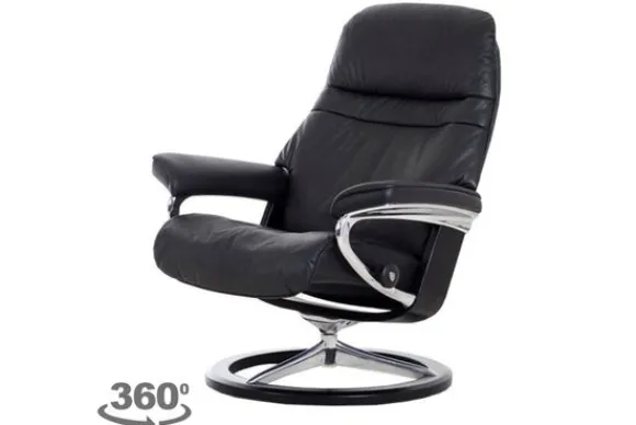 Relaxfauteuil Sunrise Signature van het merk Stressless is verkrijgbaar in alle kleuren. Tevens is de fauteuil leverbaar in stof en rundleder. Je kunt bij deze fauteuil kiezen uit diverse maten zoals Small, Medium en Large. Deze fauteuil heeft een Plus en Glide Systeem: Aan beide zijden van de fauteuil zit een knop waarmee je de weerstand van de stoel kan aanpassen naar eigen behoefte. Door de knoppen in tegengestelde richting te draaien stel je jouw ideale relaxpositie samen. Op die manier krijgt de nek en de onderrug goede ondersteuning. Door de rugleuning naar voren te buigen activeer je de slaapfunctie. Op het moment dan je weer rechtop komt stelt de stoel zichzelf weer bij naar de normale stand.