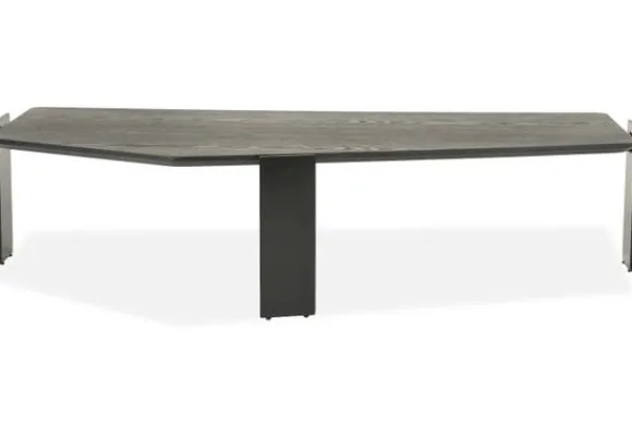 De geometrische belijning van het blad maakt de salontafel Robert bijzonder eigentijds. De robuuste metalen poten in een donkere afwerking vormen een krachtig contrast met het houten oppervlak.