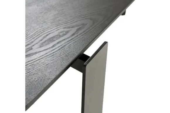 Het blad, vervaardigd uit essenhout fineer in een diepgrijze tint, straalt een tijdloze elegantie uit. De subtiele houtnerf voegt een natuurlijke textuur toe, waardoor de tafel een warme uitstraling behoudt ondanks zijn strakke vorm.