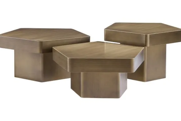 Salontafelset Hexa 213238 van het merk Richmond Interiors is een verfijnde en moderne tafelset die perfect past in een luxe interieur. Het design bestaat uit drie vijfhoekige tafels van verschillende hoogtes, vervaardigd uit metaal en afgewerkt in een warme, geborstelde goudkleur. Deze unieke combinatie van strakke lijnen en geometrische vormen geeft de set een elegant karakter.