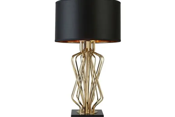 Tafellamp Ethan 4110GO van het merk Searchlight is een goud met zwarte lamp die goed bij een hotel chique inrichting past. De Ethan tafellamp is ontworpen met een vierkante marmeren voet, gouden geometrische poot, zwarte taps, een toelopende kap en een gouden interieur.