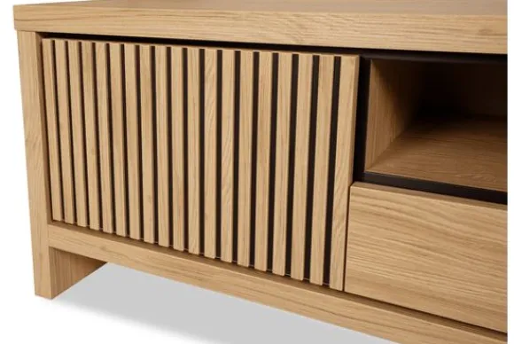 De tv-kast is voorzien van drie deuren, één lade en één open vak. Hierdoor is er ruimte voor media apparatuur, accessoires en andere spullen. Het meubel is gemaakt van sterk Lamulux materiaal. Dit materiaal heeft een houtstructuur en uitstraling die vergelijkbaar is met massief hout, maar is onderhoudsvriendelijk en geschikt voor intensief gebruik. De lade is uitgerust met softclose en ladegeleiders voor een soepele en stille sluiting. Ook de deuren sluiten zacht dankzij softclose.