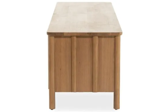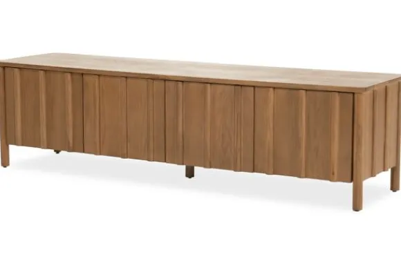 Het tv-meubel is gemaakt van massief eikenhout en eiken fineer. De bruine afwerking laat de houtnerf duidelijk zichtbaar en geeft het meubel een verzorgde uitstraling. De vier deuren zijn afgewerkt met een lamelpatroon dat zorgt voor een strak en gelijkmatig lijnenspel. Afgeronde hoeken en slanke poten dragen bij aan een luchtige opbouw.