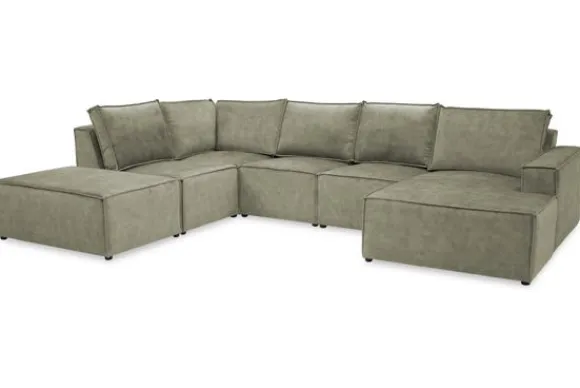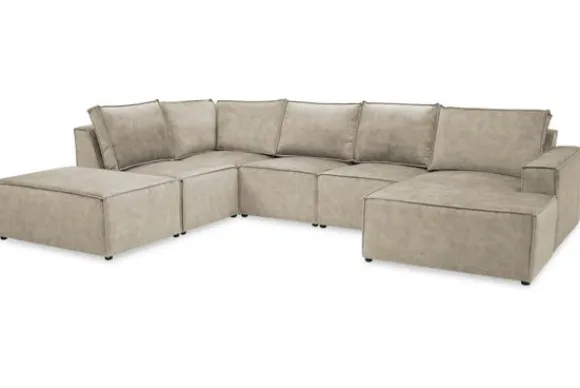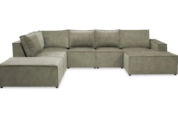 Dit bankstel is zelf samen te stellen in vele afmetingen en elementen, of je kunt gaan voor een van de standaard opstellingen. Deze opstelling is uitgerust met een speelse poef.