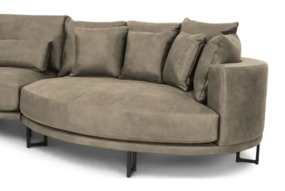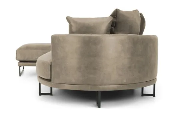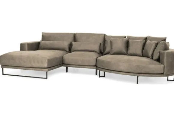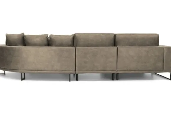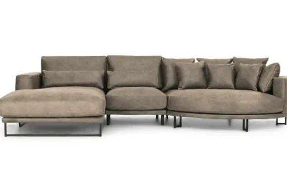 Loungebank Dordoni II van het merk Be Inspired is verkrijgbaar in alle kleuren en in materiaalsoorten zoals ribstof, teddy en velvet. De Dordoni II bank wordt standaard uitgevoerd met alle sierkussens en lendekussens die ook op de foto te zien zijn. De rugkussens daar achter zijn lekker hoog, deze combinatie zorgt voor een goede ondersteuning van de rug. Alle rugkussens zitten los en zijn omkeerbaar, de zitkussens zitten vast met klittenband. Het unieke aan de Dordoni II is het ronde loungegedeelte. Je kunt hier lekker wegkruipen tussen alle sierkussens. Deze bank oogt ruimtelijk door de hoge metalen sledepoten.