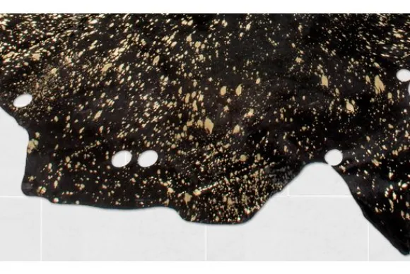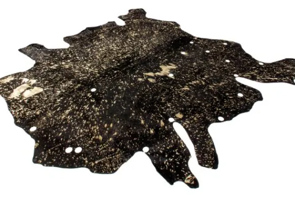 Vloerkleed Glam 110 Zwart Goud van het merk Divendo is verkrijgbaar in verschillende afmetingen en kleuren. Het ontwerp van dit leren vloerkleed kenmerkt zich door het echt geverfde leer, elegante gouden accenten en de natuurlijke contour. Aantrekkelijke uitsparingen die variëren in vorm en maat geven het tapijt een unieke uitstraling. Dankzij de bedrukte folie-elementen in het goud straalt de koeienhuid luxe en elegantie uit. Creëer een gezellige en elegante sfeer in huis door het koeienhuid vloerkleed te gebruiken als vloerbedekking, stoelhoes of wandkleed. Dit gezellige vloerkleed kan ook toegepast worden in ruimtes die voorzien zijn van vloerverwarming.