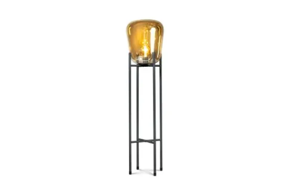 Vloerlamp Benn Gold van het merk ETH is niet alleen mooi wanneer hij brand. Overdag is het ook zeker een plaatje om naar te kijken. De grote lampenkap is voorzien van donker goudkleurig glas dat rust op een metalen frame met een zwarte poedercoating. Door het gekleurde glas geeft de lichtbron sfeervol licht, waardoor het licht niet te fel is. De Benn lampencollectie bestaat uit een hang-, vloer- en tafellamp.