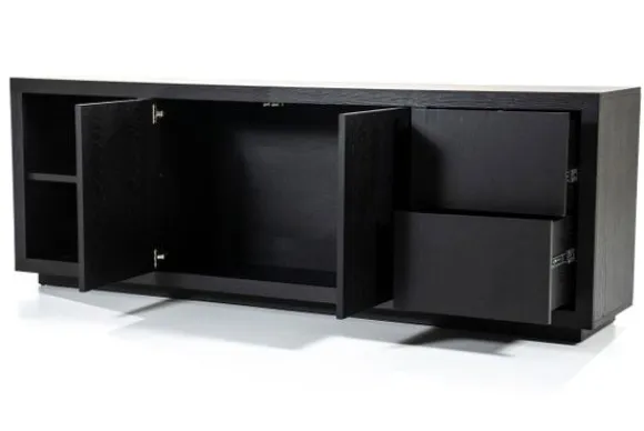 Het dressoir heeft twee deuren, twee lades en twee open vakken. Deze indeling biedt praktische opbergruimte voor servies, accessoires of papieren. De open vakken geven het meubel een open en functioneel karakter. Het dressoir maakt deel uit van de Helsinki met bijpassende meubels.