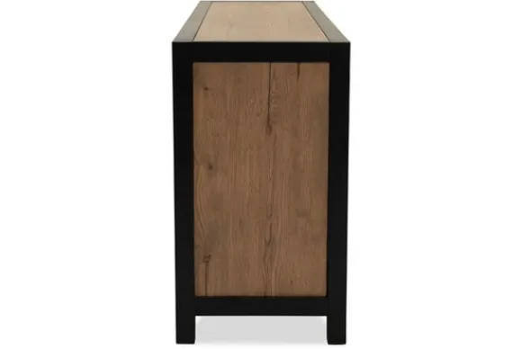 Het dressoir is vervaardigd uit massief eikenhout met zichtbare nerf. Het zwarte metalen frame omlijst het meubel en voegt een luxe, tijdloos accent toe.