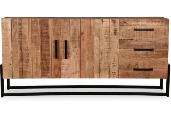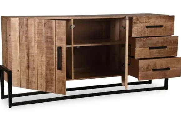 Dressoir Bolivia AH-57.007 van het merk Label51 kenmerkt zich door de prachtige verticaal gefreesde nerven in het levendige mangohout. Het indrukwekkende zwarte frame geeft de illusie dat de kast zweeft. Kortom; een slim vormgegeven kast waar op stijlvolle wijze spullen in opgeborgen kunnen worden.