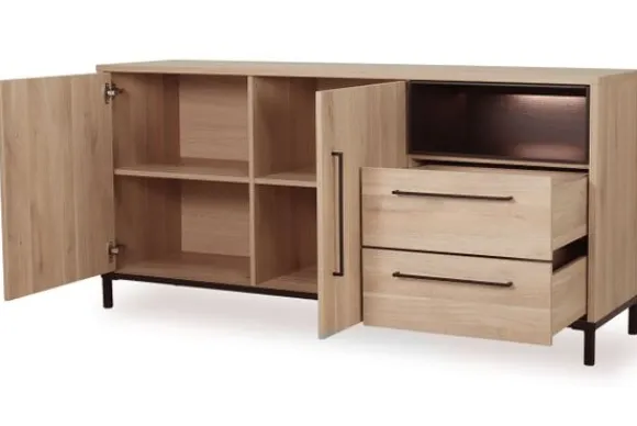 Dit dressoir heeft twee lades, een open vak met verlichting en twee deuren met extra planken achter. De ledverlichting (niet dimbaar) is te bedienen met een voet- of drukschakelaar. Dressoir Alberta – Bridge is onderdeel van een complete , waarin ook tv-meubels, bergkasten en salontafels verkrijgbaar zijn.