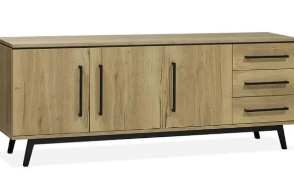 Het dressoir biedt diverse opbergmogelijkheden met drie deuren en drie lades. De lamulux toplaag is kras-, slijt- en stootvast, voelt aan als massief hout maar kent geen houtwerking. Lamulux is eenvoudig te onderhouden, voorzien van kindvriendelijke afwerking en de lades en deuren zijn uitgerust met een softclose systeem.