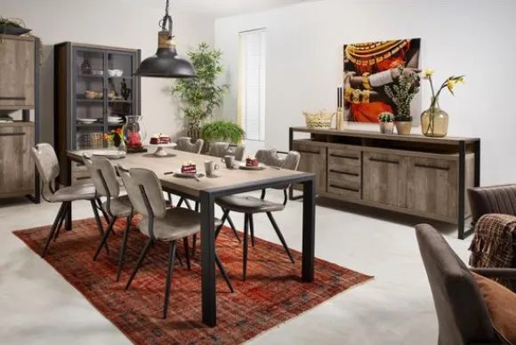 Het dressoir biedt een veelzijdige indeling met bovenin drie open vakken voor decoratie of snelle opbergplek. Daaronder bevinden zich drie gesloten deuren met planken en drie lades. De langwerpige zwarte metalen handgrepen geven het meubel een moderne uitstraling. Alle deuren en lades zijn voorzien van soft-close dempers en soepele ladegeleiders, zodat alles geruisloos sluit.