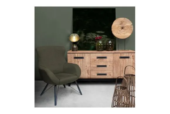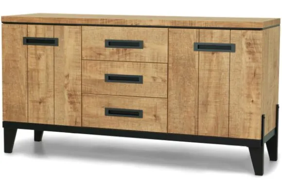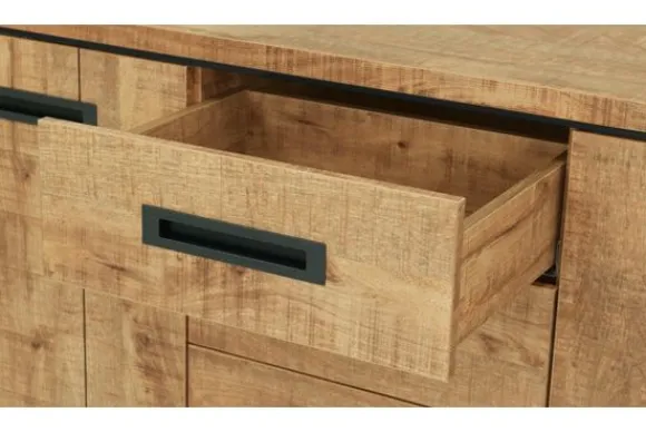 Dressoir Lucania – Union van het merk Lamulux is uitgevoerd in de kleur Mango en heeft een stoere uitstraling. De combinatie van hout met metalen poten en handgrepen geeft het dressoir een krachtig en eigentijds karakter. De kast is praktisch ingedeeld met twee deuren met verticale planken en drie lades in het midden.