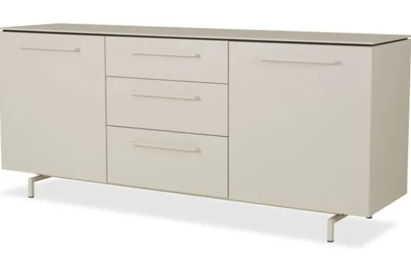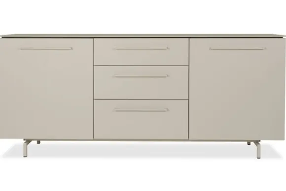 Dressoir Ortega van het merk Lamulux is een modern dressoir met een rustige en tijdloze uitstraling. De kast is uitgevoerd in een ivoorkleur en heeft strakke lijnen die goed passen in een modern, Scandinavisch of Japandi interieur. De handgrepen in dezelfde kleur zorgen voor een strak geheel, terwijl de metalen pootjes het dressoir een lichte en moderne basis geven.