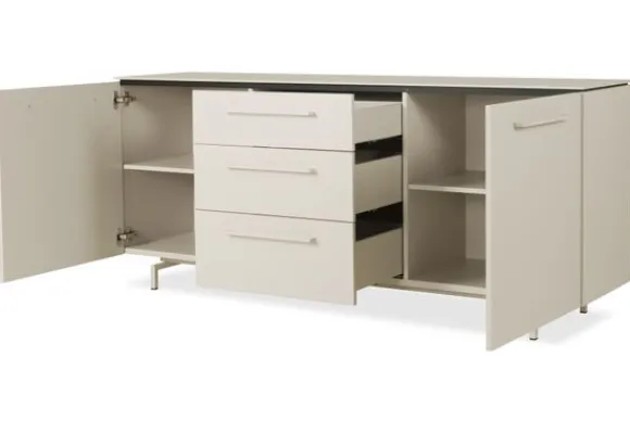 Het Ortega dressoir beschikt over een praktische indeling met lades en kastdeuren. Hierdoor is er voldoende ruimte om spullen overzichtelijk op te bergen. De lades en deuren zijn voorzien van softclose, wat zorgt voor een stille sluiting en prettig dagelijks gebruik.