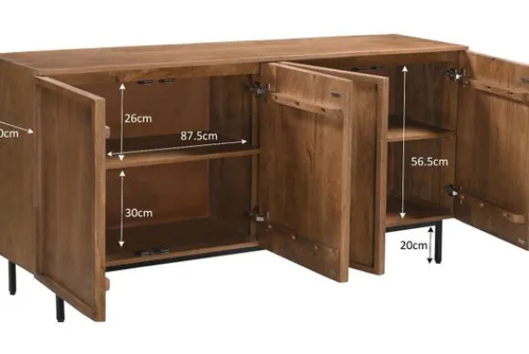 Het dressoir is voorzien van vier openslaande deuren en biedt daarmee ruime opbergruimte voor servies, woonaccessoires of andere spullen. Dressoir Elan maakt deel uit van een met bijpassende meubels.