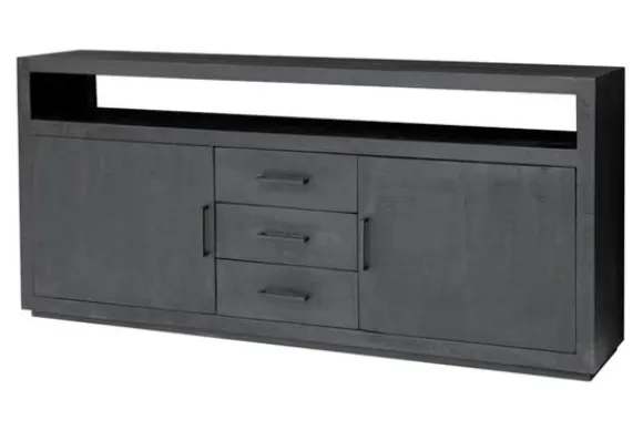 In het midden van het dressoir bevinden zich drie lades. Aan weerszijden is een deur geplaatst voor extra opbergruimte. Bovenin zit één groot open vak, ideaal voor decoratie of apparatuur.