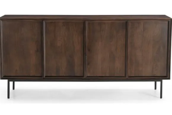 Dressoir Ravenstein van het merk Livingfurn is gemaakt van mangohout en geeft een strakke, minimalistische look aan de ruimte. Het dressoir biedt voldoende opbergruimte achter de greeploze deuren.