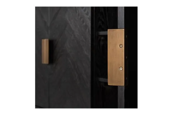 De kast is gemaakt van eiken fineer, waarvan de delen in een chique visgraatmotief zijn gelegd. Het strakke onderstel is gemaakt van metaal in de kleur Brass (staal in mat goud).