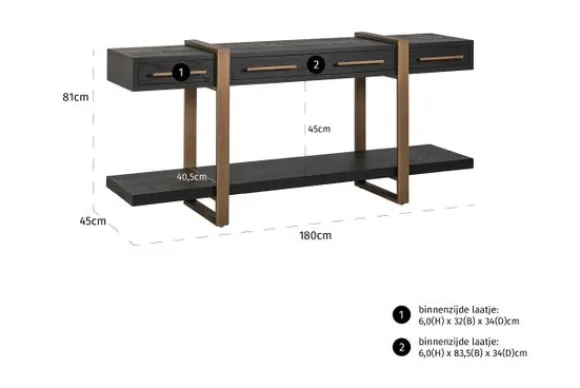 Dressoir Cambon 211170 van het merk Richmond Interiors is een strak, chique dressoir. Het dressoir is gemaakt van eiken en eiken fineer. Het dressoir is voorzien van vier lades, welke aan de binnenzijde een afmeting heeft van H6xB32xD34 cm. Onder de lades is nog een prachtige open ruimte waar je bijvoorbeeld je mooiste accessoires neer kunt zetten. Deze open ruimte heeft een afmeting van H45xB180xD40,5 cm.